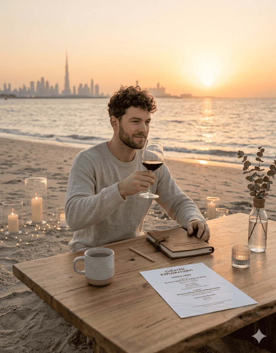 The image a man enjoying sunset in Dubai and planning a trip. Photo Credit: AI-generated image
