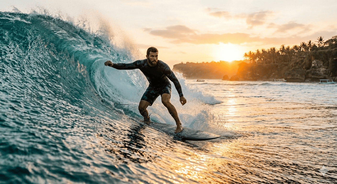 This image shows a surfer riding a wave during sunset. Photo Credit: AI-generated image