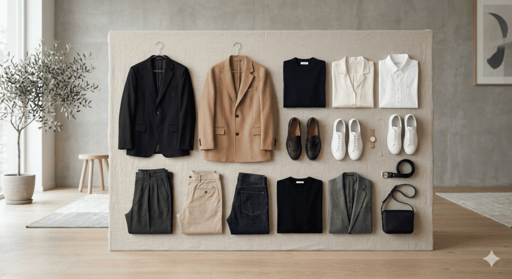 This image displays a collection of versatile men’s clothing items and accessories. Photo Credit: AI-generated image