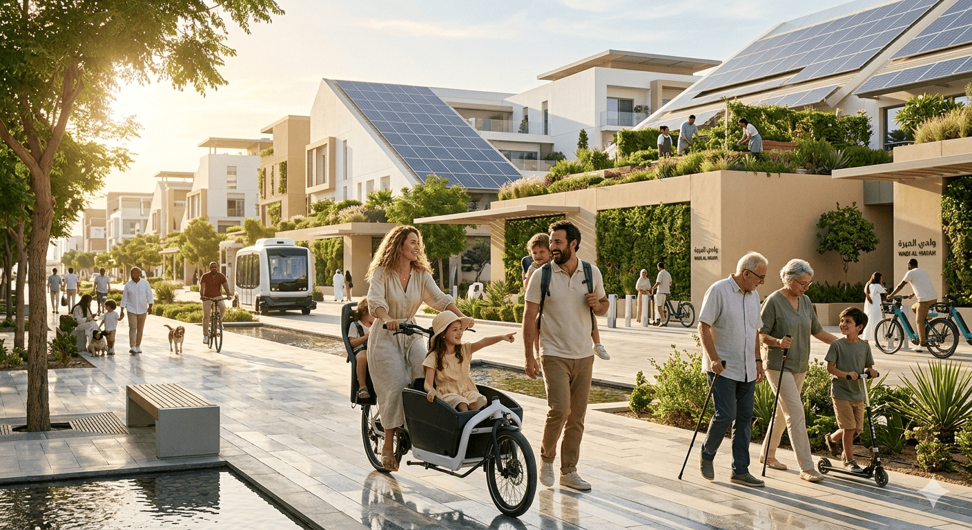 This image showcases a modern, pedestrian-friendly residential community designed. Photo Credit: AI-generated image