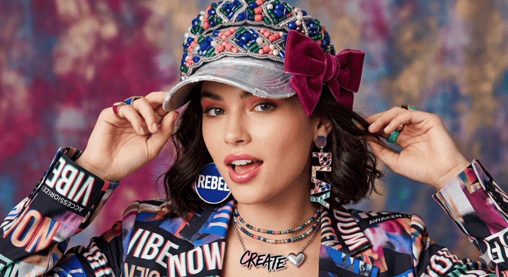 This image shows a person wearing fashion accessories and clothing featuring colorful, graphic-printed patterns. Photo Credit: AI-generated image