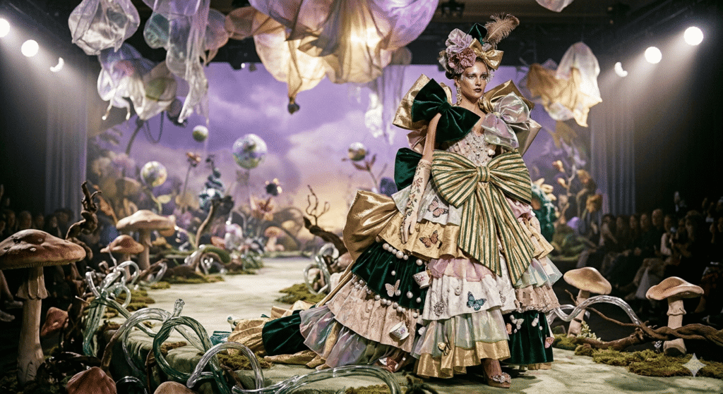 This image shows a scene from a fashion show runway featuring a model wearing an elaborate, highly detailed couture gown. Photo Credit: AI-generated image
